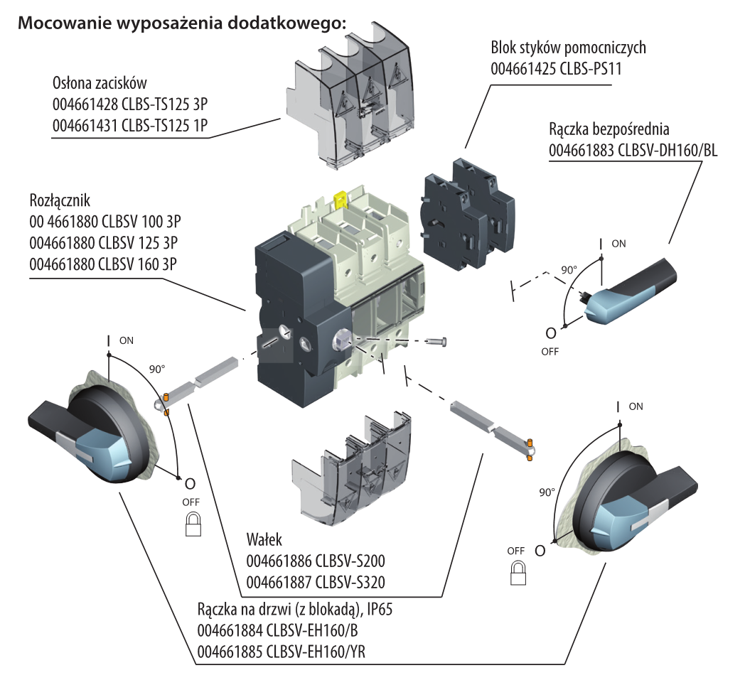 - Styki pomocnicze wyprzedzające CLBS-PS11. Zmiana stanu styków wyprzedza zmianę stanu torów głównych aparatu przy przejściu z pozycji I do 0. Styki instaluje się na prawej stronie aparatu.