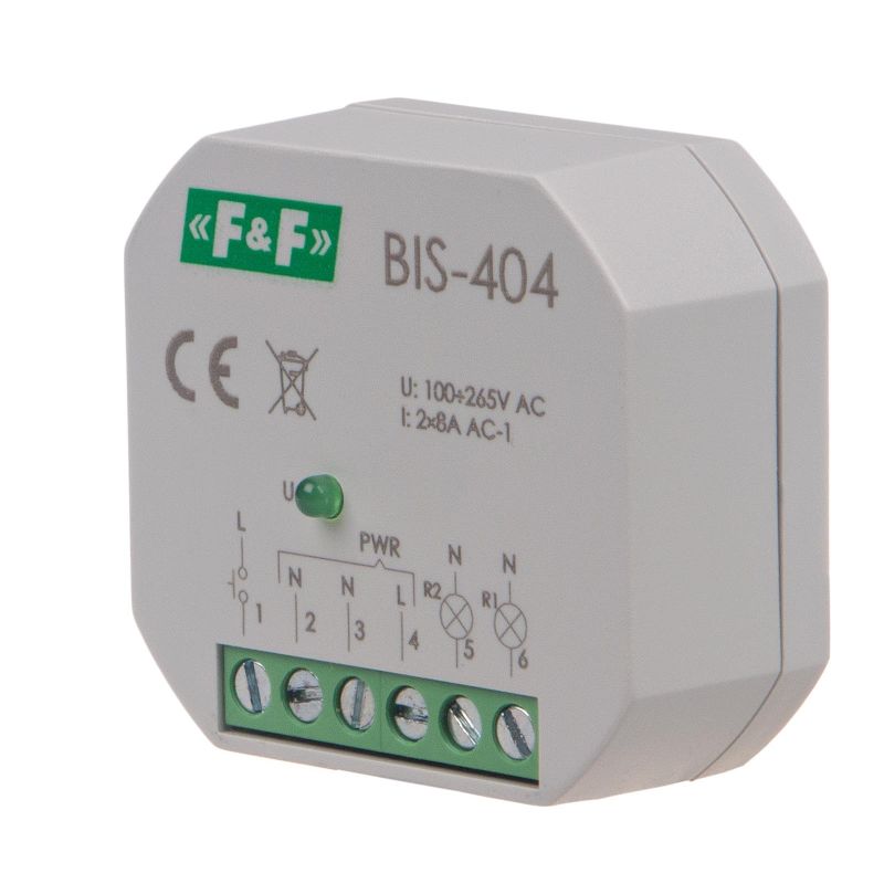 Zasilanie przekaźnika bistabilnego sygnalizowane jest świeceniem zielonej diody U. Przekaźnik świecznikowy posiada dwa oddzielne wyjścia R1 i R2. Stan wyjść wymuszany jest sekwencyjnie za pomocą łącznika chwilowego (dzwonkowego) podłączonego do wejścia sterującego. Po zaniku napięcia zasilania stan styków jest resetowany.
