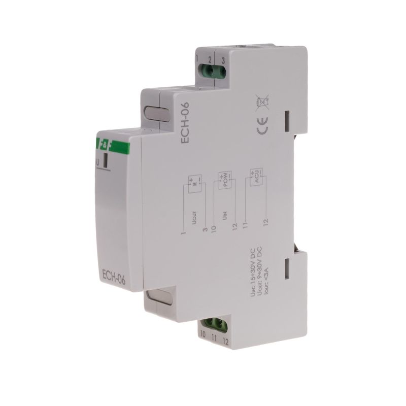 Moduł ECH-06 wraz z zewnętrznym akumulatorem żelowym o napięciu nominalnym 12 V stanowi układ zasilania rezerwowego dla odbiorników o napięciu zasilania w zakresie 9÷30 V DC.