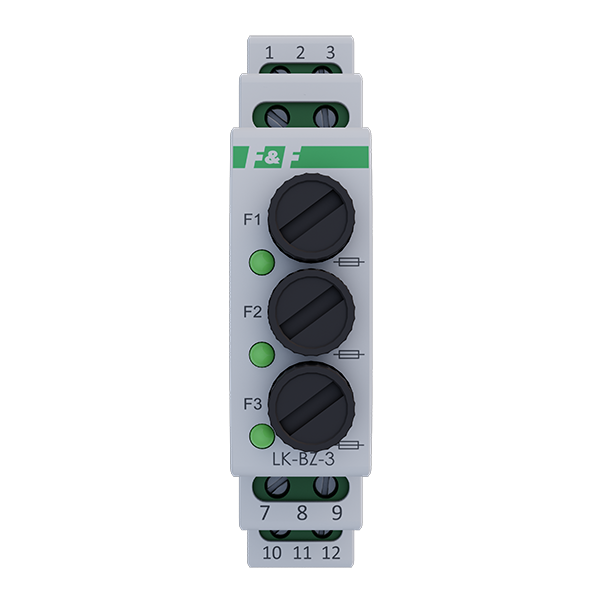 Obecność napięcia za bezpiecznikiem sygnalizowana jest świeceniem odpowiedniej diody LED włączonej w obwód tej fazy. W przypadku zaniku napięcia fazy bądź przepalenia wkładki topikowej, kontrolka nie świeci sygnalizując brak napięcia.