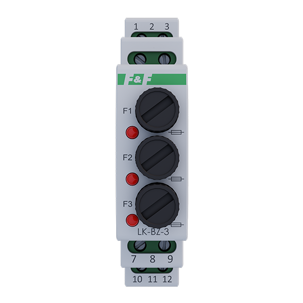 Obecność napięcia za bezpiecznikiem sygnalizowana jest świeceniem odpowiedniej diody LED włączonej w obwód tej fazy. W przypadku zaniku napięcia fazy bądź przepalenia wkładki topikowej, kontrolka nie świeci sygnalizując brak napięcia.
