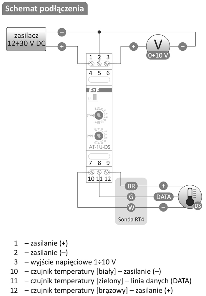 Przetwornik temperatury AT-1U-DS przeznaczony jest do pomiaru temperatury przy wykorzystaniu cyfrowego czujnika temperatury serii DS1820 i przekształcaniu wyniku pomiaru do postaci analogowego sygnału napięciowego w zakresie 1÷10 V.