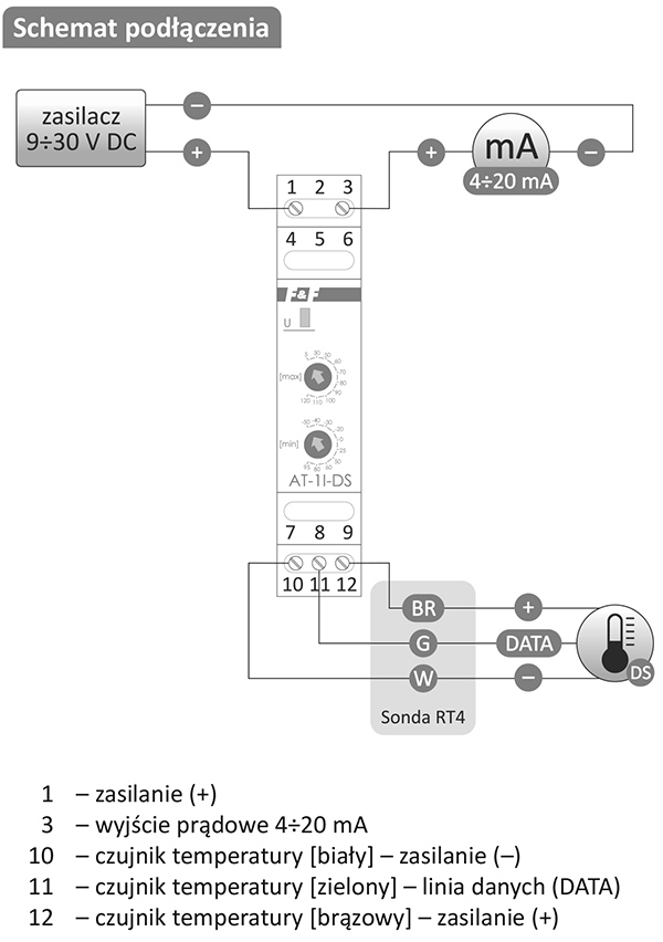 Przetwornik temperatury AT-1I-DS przeznaczony jest do pomiaru temperatury przy wykorzystaniu cyfrowego czujnika temperatury serii DS1820 i przekształcaniu wyniku pomiaru do postaci analogowego sygnału prądowego w zakresie 4÷20 mA.