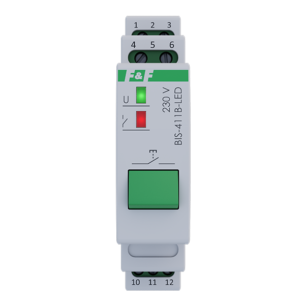 Przekaźnik BIS‑411B posiada przycisk na elewacji, który umożliwia sterowanie obwodem, bez konieczności wyzwalania przycisków zewnętrznych.