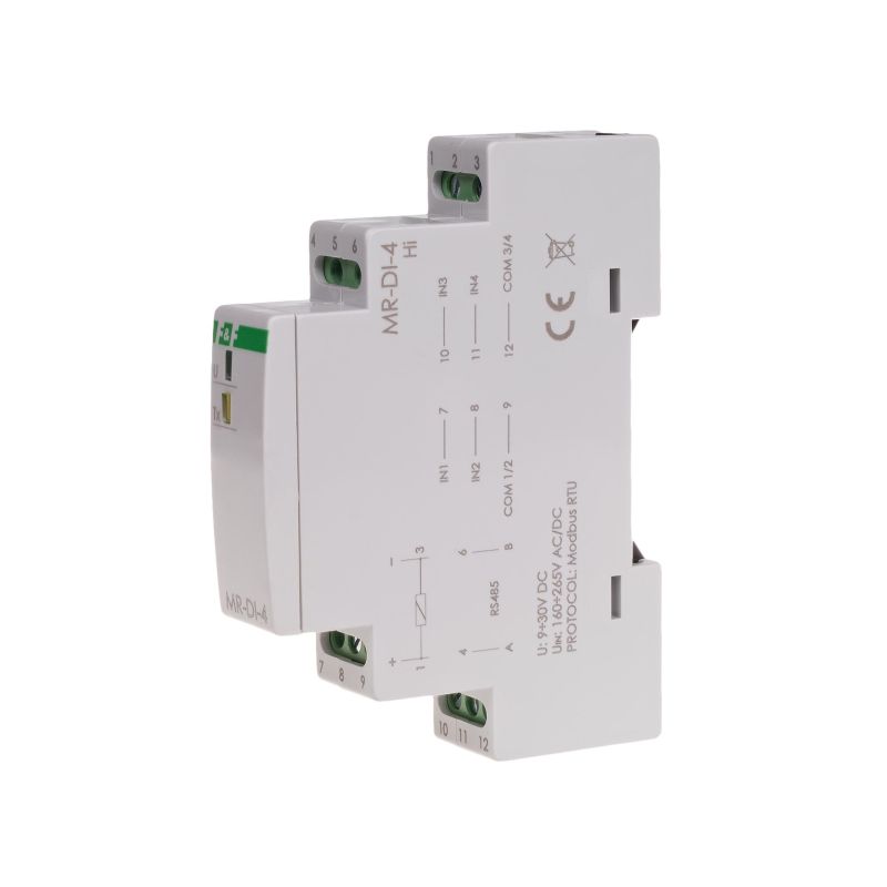 Moduł rozszerzeń MR-DI-4 służy jako zewnętrzne urządzenie rozszerzające wejścia cyfrowe sterowników programowalnych PLC lub innych urządzeń, w których wymiana danych odbywa się za pomocą portu RS-485 zgodnie z protokołem MODBUS RTU.