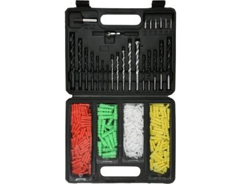 Zestaw 300 elementów zawierający wiertła i kołki marki Vorel 24100, przeznaczone do precyzyjnego wiercenia otworów w metalu, betonie, cegle i drewnie. Umożliwia wiercenie bez punktowania, zapakowany w walizkę z czytelnymi oznaczeniami.