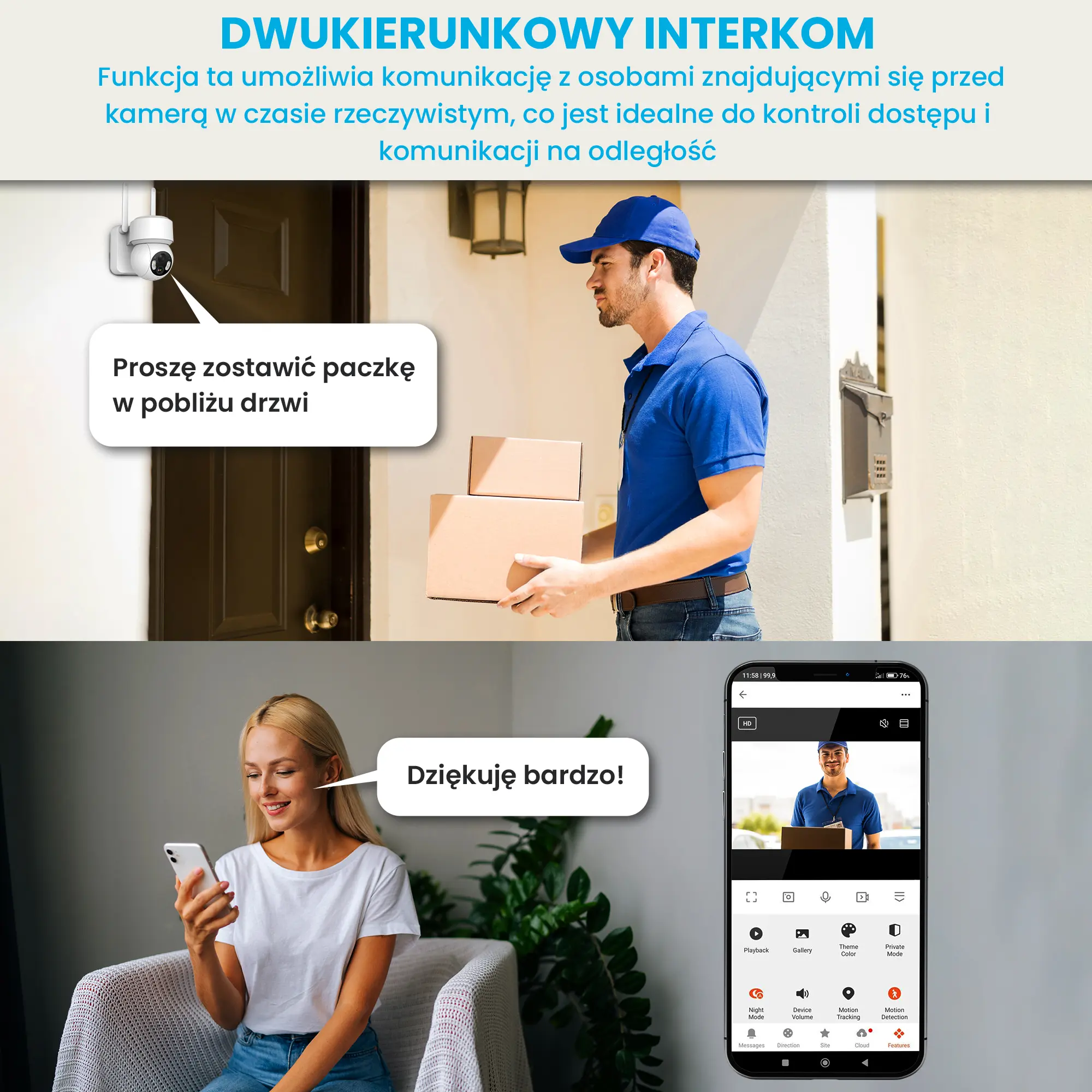 - Dwukierunkowy interkom: Funkcja ta umożliwia komunikację z osobami znajdującymi się przed kamerą w czasie rzeczywistym, co jest idealne do kontroli dostępu i komunikacji na odległość
