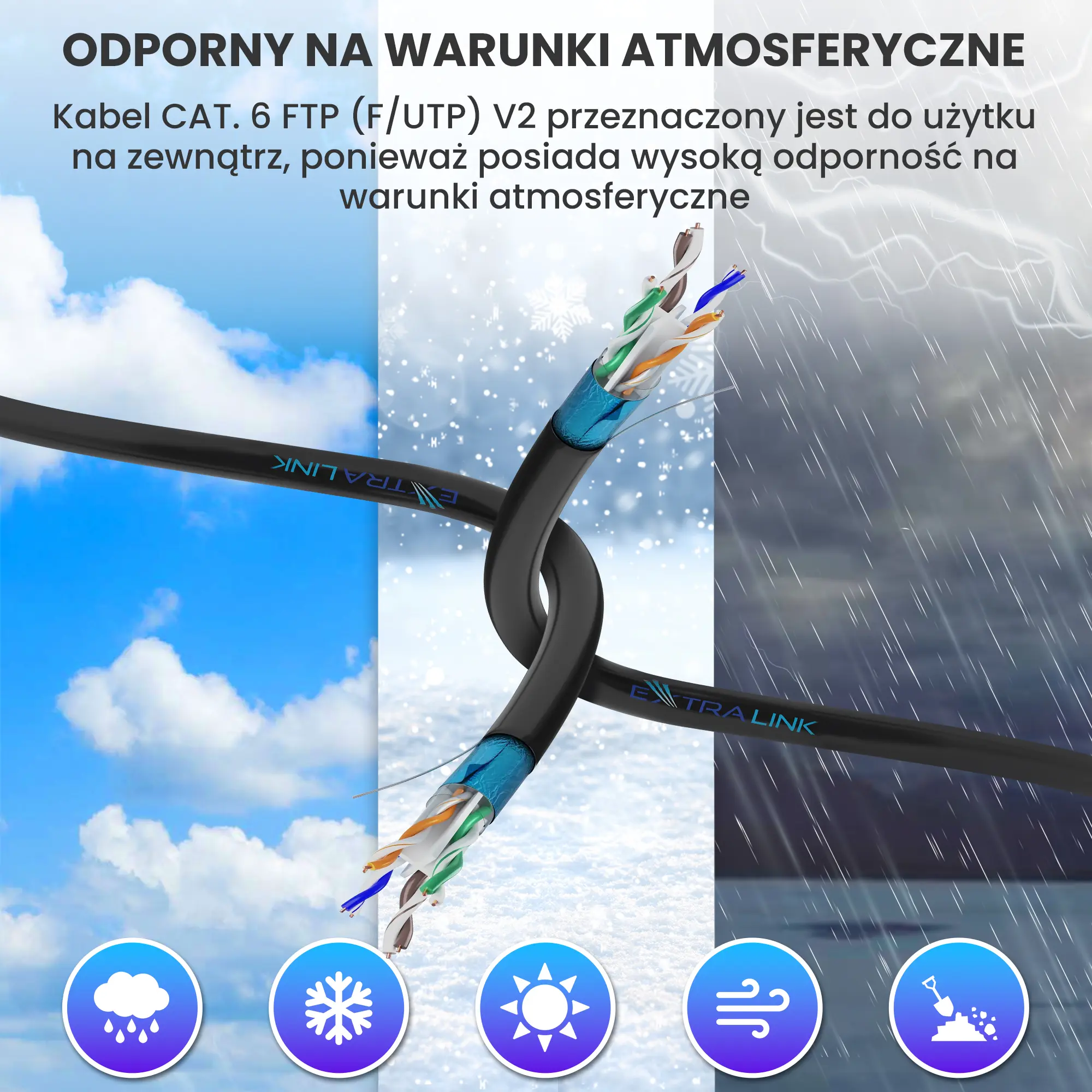 Kabel Extralink CAT6 FTP (F/UTP) V2 przeznaczony jest do użytku na zewnątrz, posiada wysoką odporność na warunki atmosferyczne. Skrętka często wykorzystywana jest także w instalacjach telewizji przemysłowej, gdzie jednym kablem można przesłać sygnał wizji z kilku kamer i zasilanie.