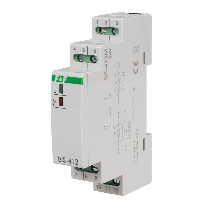 - BIS-412M 230 V - z pamięcią pozycji styku. Po załączeniu zasilania zostanie przywrócony stan przekaźnika jaki był w momencie wyłączenia zasilania.