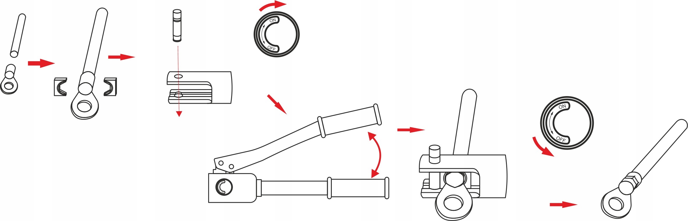 Do wybranego rozmiaru przewodu, należy dopasować odpowiedni rozmiar końcówki do zaciśnięcia. Następnie należy umieścić końcówkę na środku matrycy zaciskowej. Po zablokowaniu matrycy, bolcem oporowym, należy dokręcić zawór główny siłownika - w kierunku ON. Następnie należy unieść ramię siłownika, aby napędzić pracę tłoka. Należy opuszczać ramię, kilkukrotnie, do momentu aż matryce połączą się ze sobą.