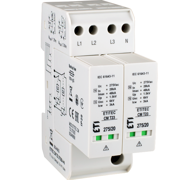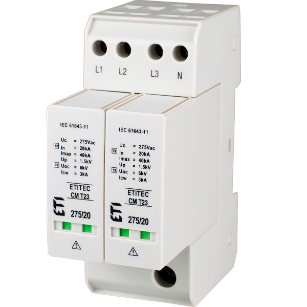 Wyładowania atmosferyczne mogą powodować groźne przepięcia w instalacji elektrycznej skutkujące uszkodzeniem instalacji, urządzeń elektrycznych a nawet pożarem. Ogranicznik przepięć ETITEC CM T23 stanowi 2‑gi lub 3‑ci stopień zabezpieczenia przed przepięciami wywołanymi wyładowaniem atmosferycznym pośrednim lub łączeniowym. Dzięki specjalnemu wykonaniu jest dwa razy mnijeszy od klasycznego aparatu!
