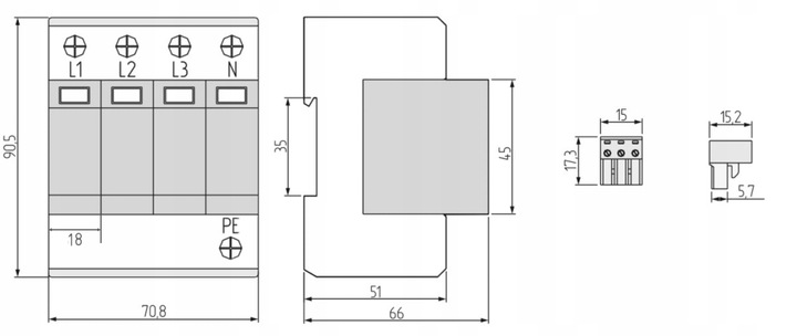 Ochronnik przeciwprzepięciowy 1-polowy, 1-fazowy, klasa B+C, 30-60 kA, do montażu na szynę TH35, z pilotem do zdalnej sygnalizacji.
