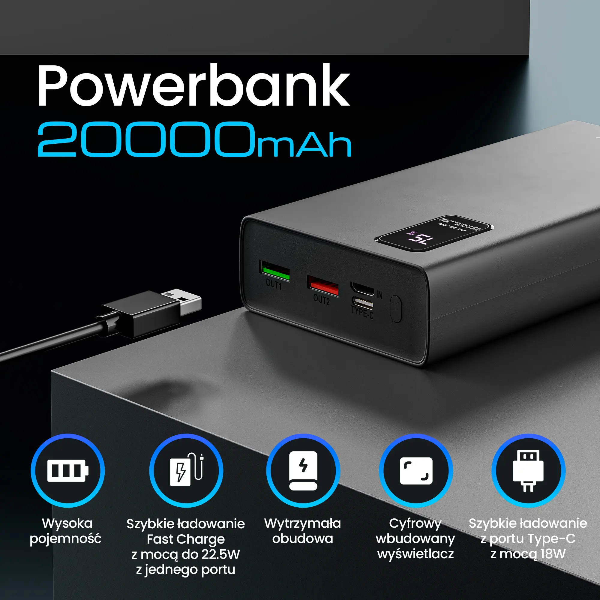 Power bank 20000 mAh 22.5W Fast Charge marki Extralink – szybkie, wydajne ładowanie
