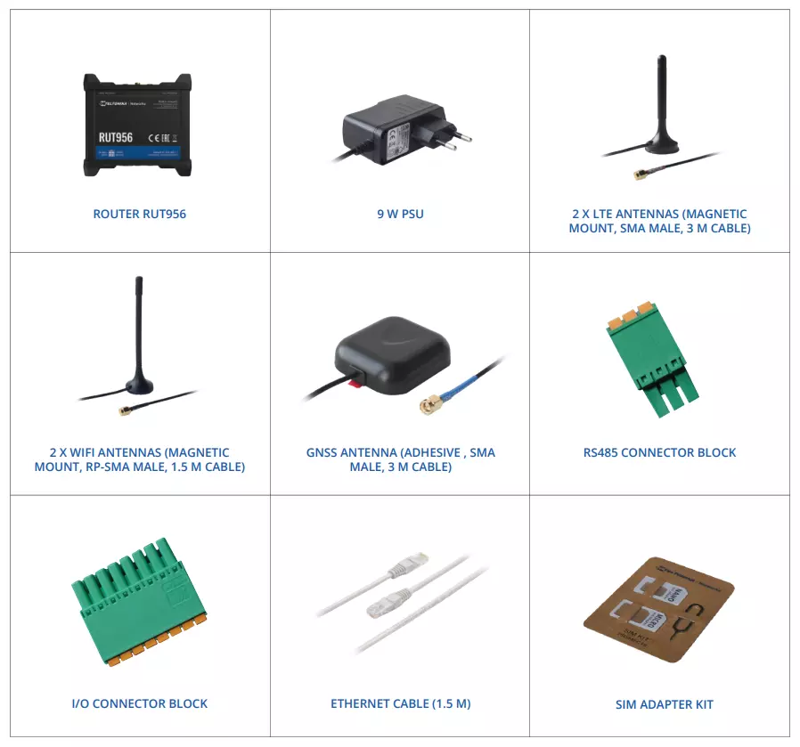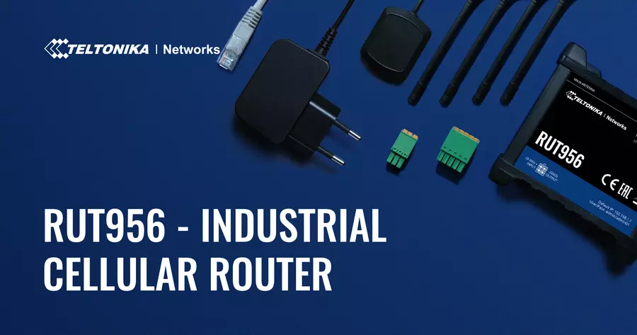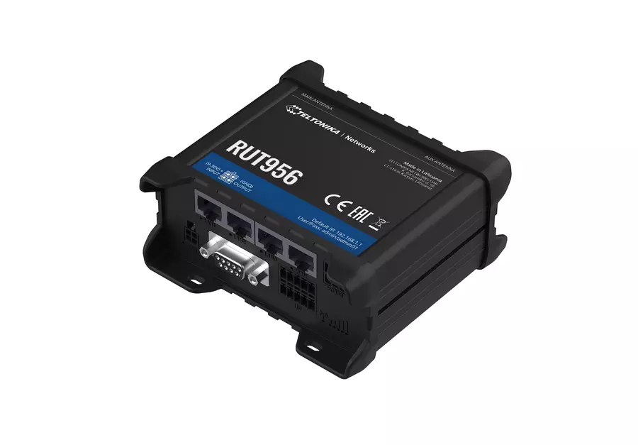 Teltonika RUT956 to router przemysłowy, który łączy w sobie opcje łączności komórkowej 4G LTE, Wi-Fi i przewodowej w standardzie dual-SIM oraz dodatkowo oferuje funkcje GNSS. Urządzenie jest wyposażone w łączność komórkową dual SIM 4G, Wi-Fi oraz 4 interfejsy Ethernet, dzięki czemu spełnia potrzeby najbardziej zróżnicowanych rozwiązań IoT.