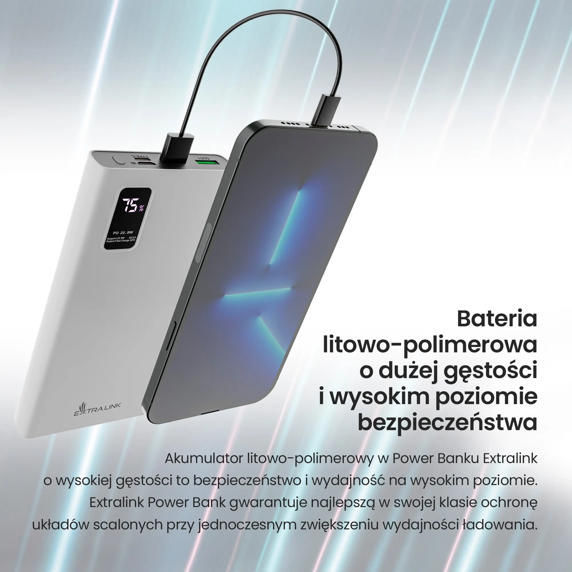 Akumulator litowo-polimerowy w power banku Extralink o wysokiej gęstości to bezpieczeństwo i wydajność na wysokim poziomie. Extralink Power Bank gwarantuje najlepszą w swojej klasie ochronę układów scalonych przy jednoczesnym zwiększeniu wydajności ładowania.