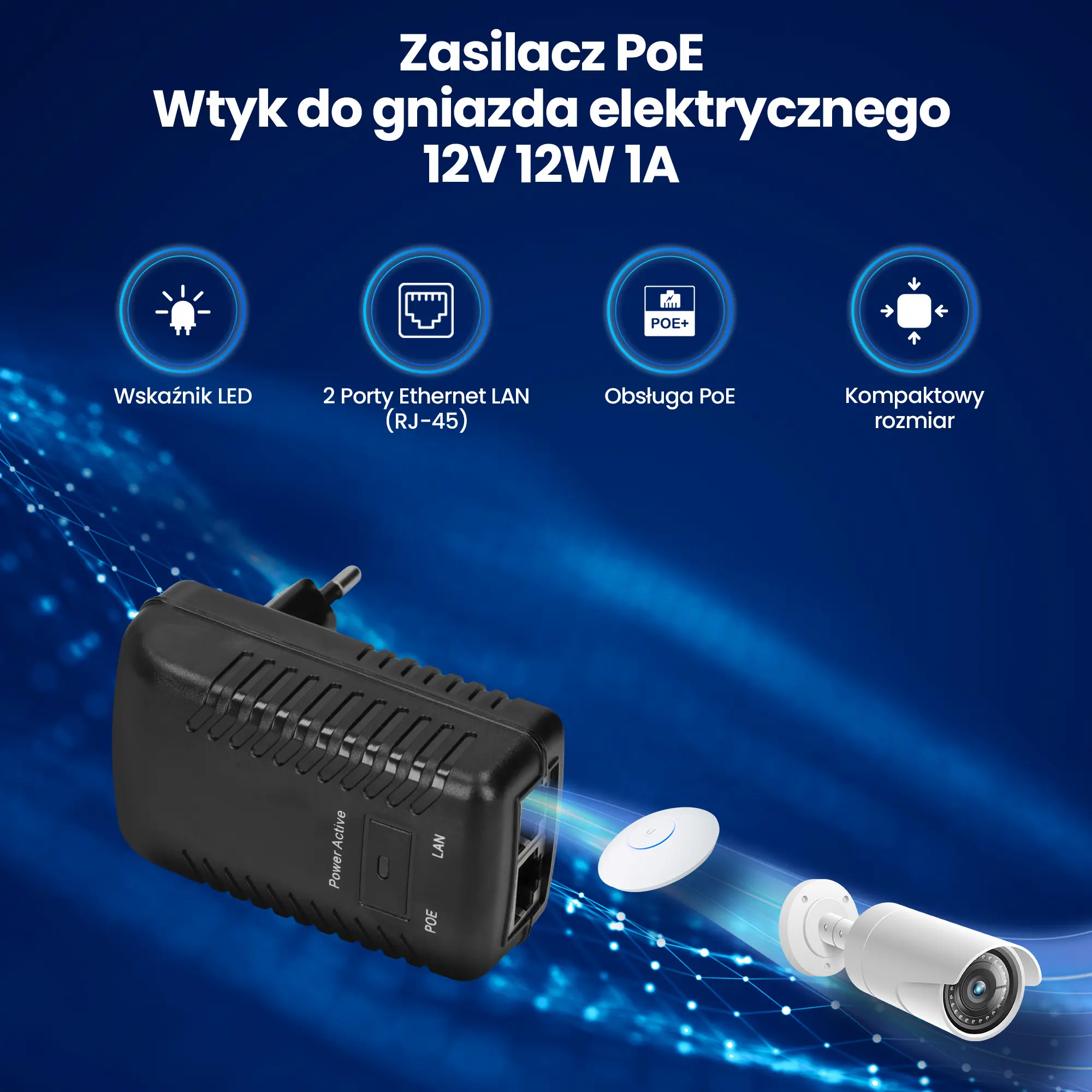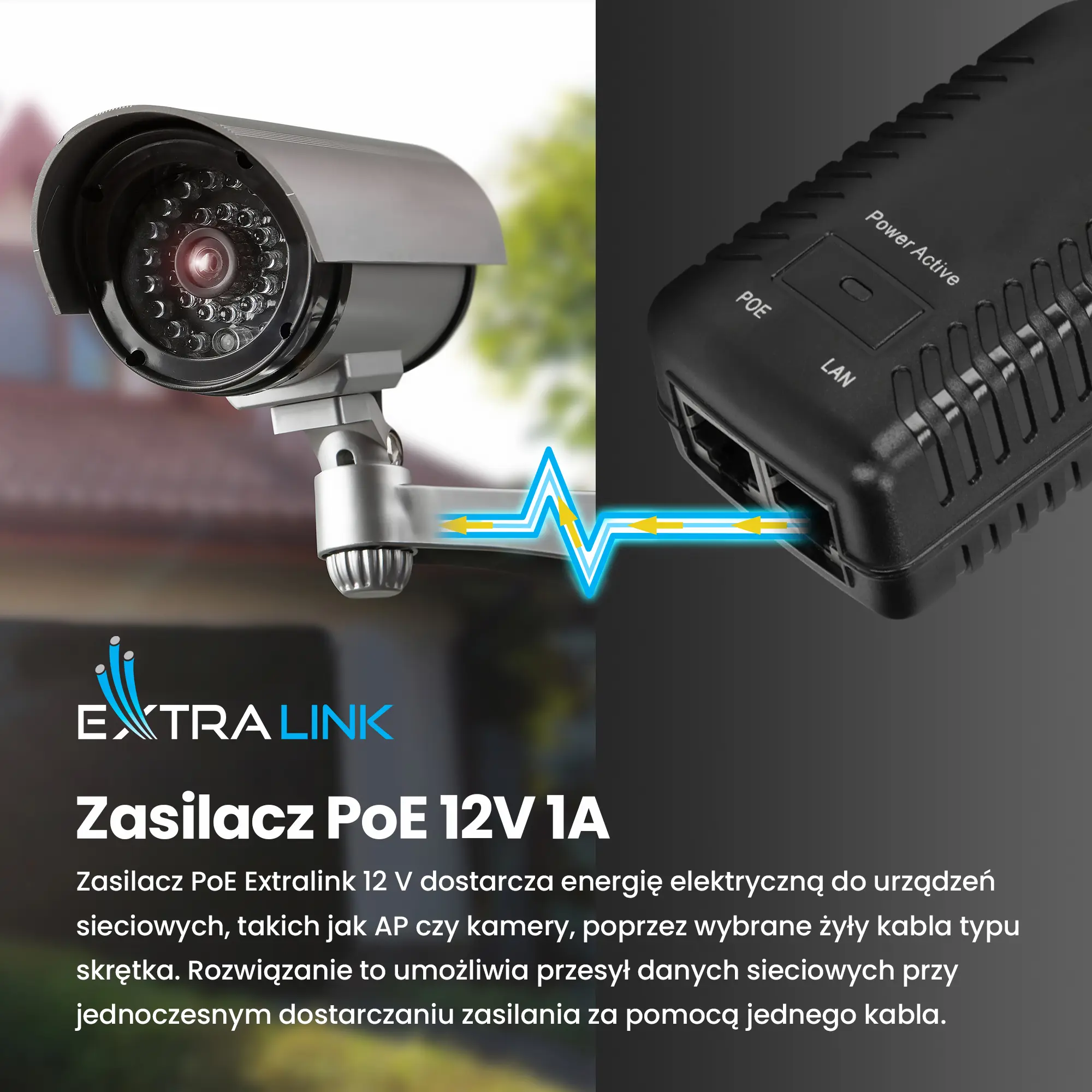 Zasilacz PoE Extralink 12 V to urządzenie, które dostarcza energię elektryczną do różnych urządzeń sieciowych, takich jak Access Points czy kamery. Dzięki temu, że zasilanie jest przesyłane przez wybrane żyły kabla typu skrętka, możliwe jest jednoczesne przesyłanie danych sieciowych i dostarczanie zasilania za pomocą jednego kabla.