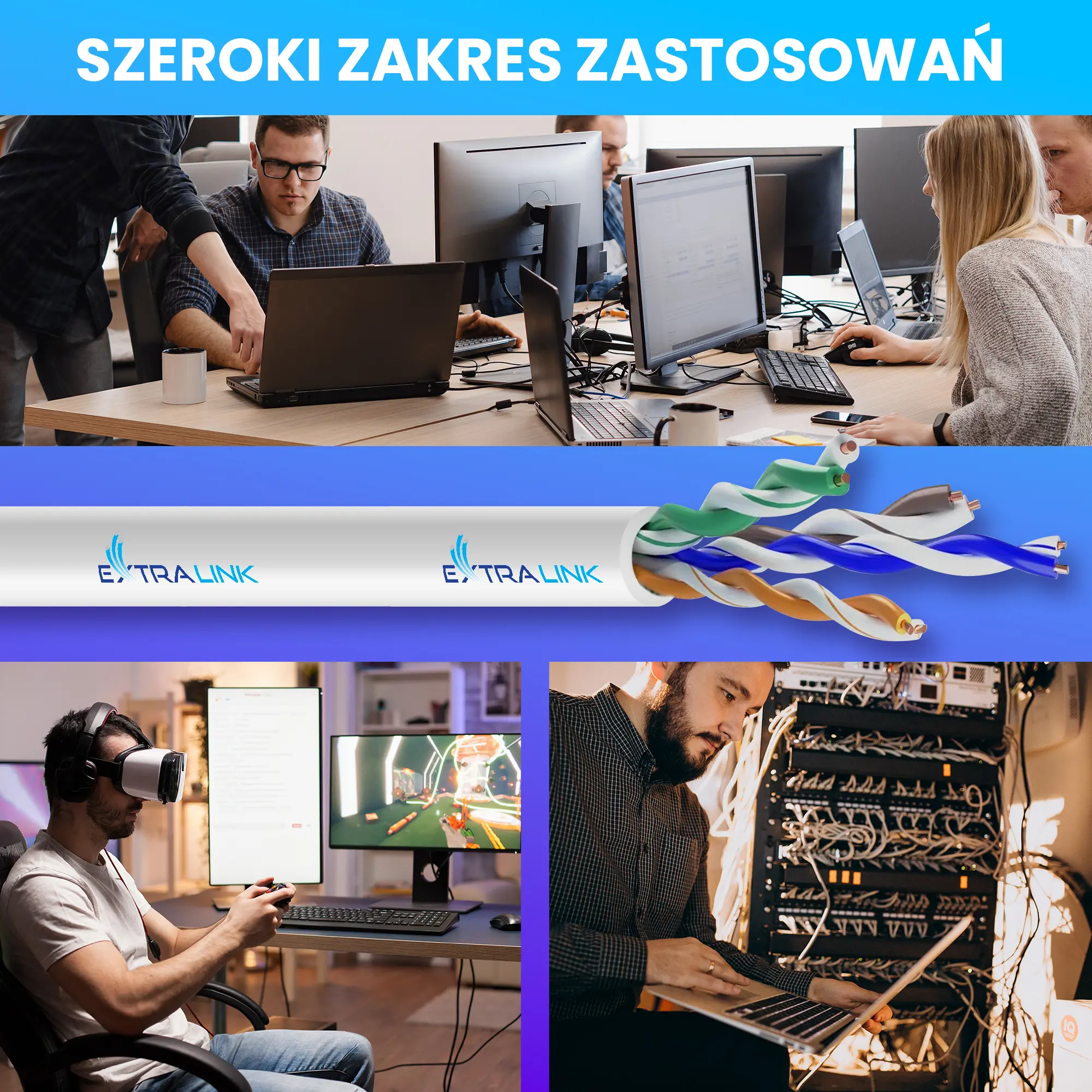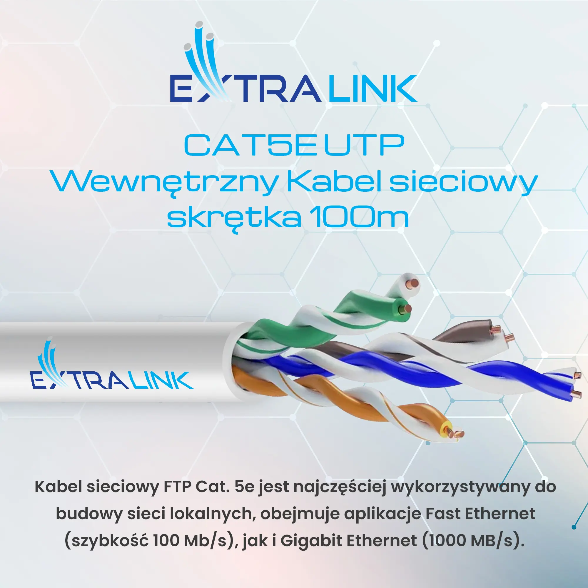 Kabel Extralink CAT 5E UTP (U/UTP) V2 przeznaczony jest do użytku wewnątrz budynków, nadaje się idealnie do budowy sieci w biurach. Skrętkę stosuje się często w instalacjach telewizji przemysłowej, gdzie jednym kablem można przesłać sygnał wizji z kilku kamer i zasilanie.