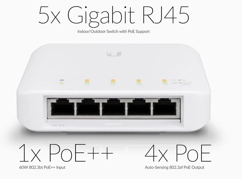 Ubiquiti USW-Flex to switch sieciowy, który umożliwia zasilanie urządzeń za pomocą technologii PoE. Urządzenie to obsługuje maksymalną moc wyjściową PoE wynoszącą 46 W przy zasilaniu 60 W 802.3bt PoE++. Dzięki czterem portom 802.3af PoE, switch pozwala na zasilanie wielu urządzeń w sieci, oferując jednocześnie automatyczne wykrywanie sygnału.