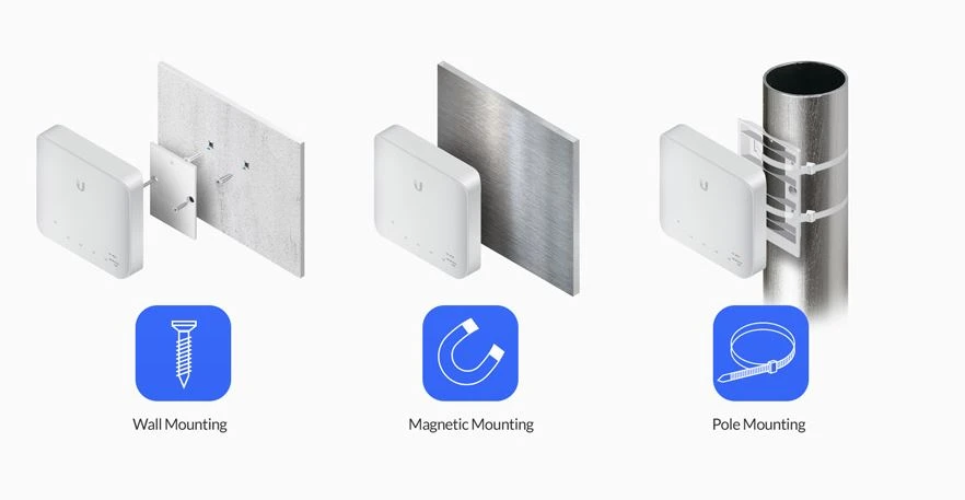 USW-Flex może być zainstalowany poziomo lub pionowo, dzięki magnetycznym uchwytom montażowym idealnie nadaje się do umieszczenia urządzenia na biurku, ścianie oraz na słupie.
