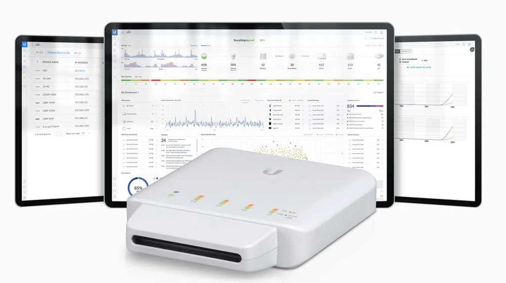 Pojedyncza instancja kontrolera UniFi działającego w chmurze może zarządzać wieloma witrynami UniFi w ramach scentralizowanego interfejsu. Każda witryna jest logicznie oddzielona i posiada własny monitoring sieci, konfigurację, mapy, statystyki i konta administracyjne.