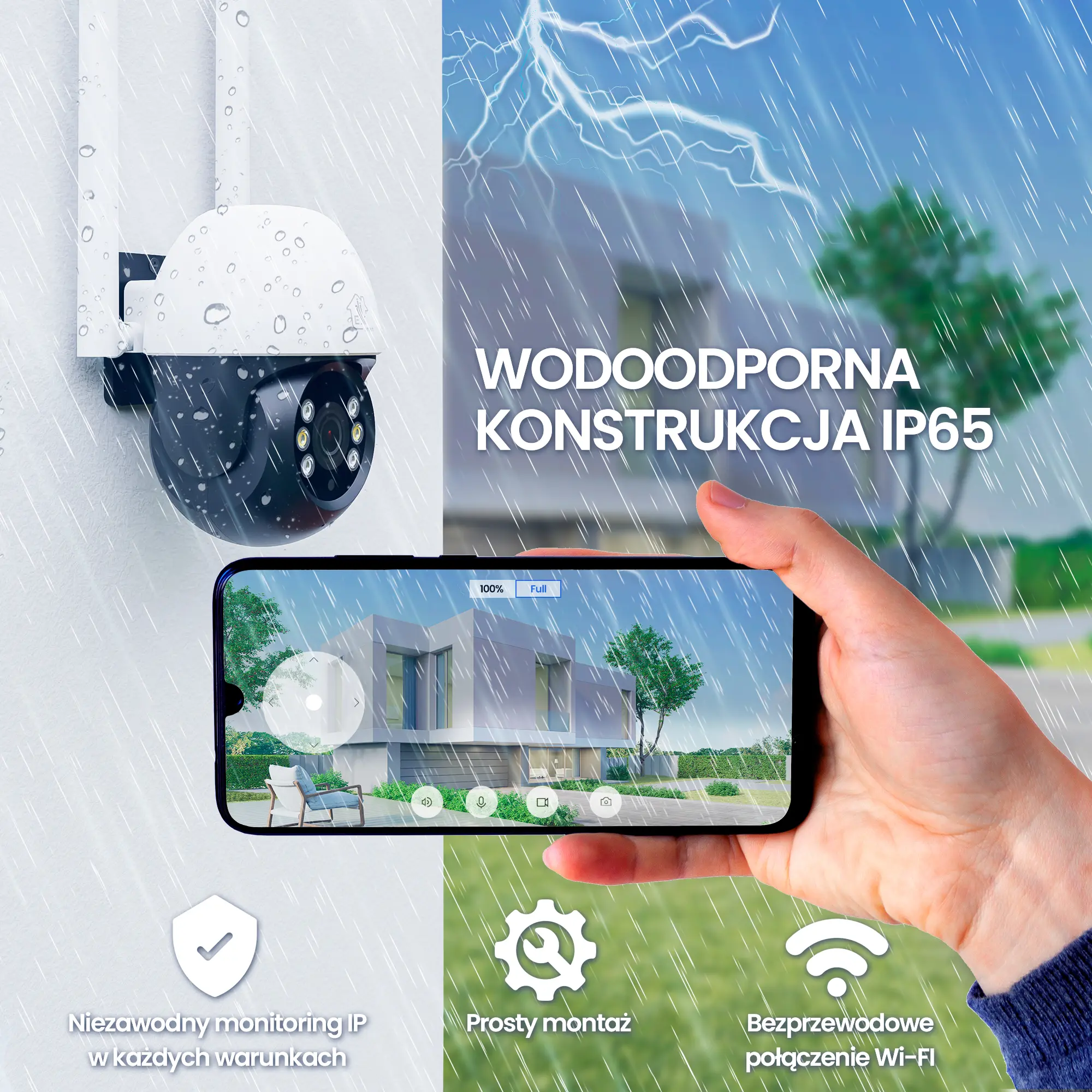 Kamera bezprzewodowa wifi posiada wodoodporną konstrukcję IP65 (klasa szczelności), która całkowicie zapobiega przedostawaniu się kurzu i wody. Kamera wifi ip może pracować bez zarzutu na zewnątrz, niezależnie od ulewnego deszczu czy ekspozycji na słońce. Nie musisz się martwić, że deszcz i śnieg wpłyną na jakość obrazu.