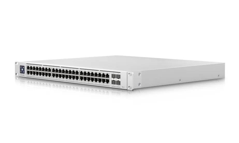 Przełącznik Enterprise 48 PoE montowany w szafie rack z 48 portami 2.5GbE, 802.3at PoE+ RJ45, 4 portami 1 Gigabit / 10 Gigabit SFP+. Przełączanie przepustowości wynosi 160 Gbps, natomiast zdolność przełączania jest dwa razy większa (320 Gbps).