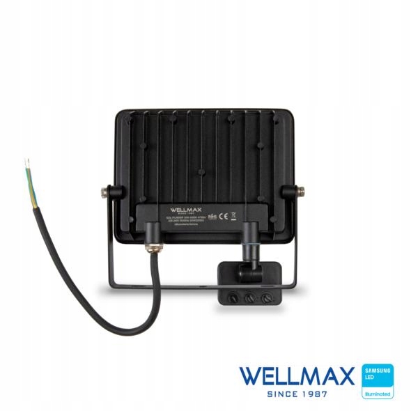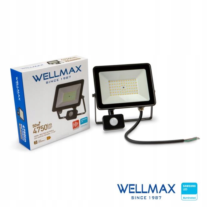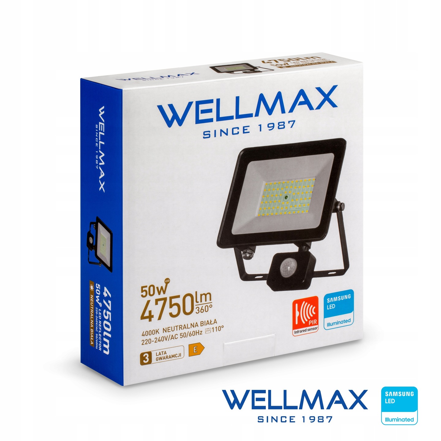 Naświetlacz WELLMAX LED SAMSUNG 50W 4750lm PIR Barwa Neutralna Biała 4000K z Czujnikiem Ruchu i Światła