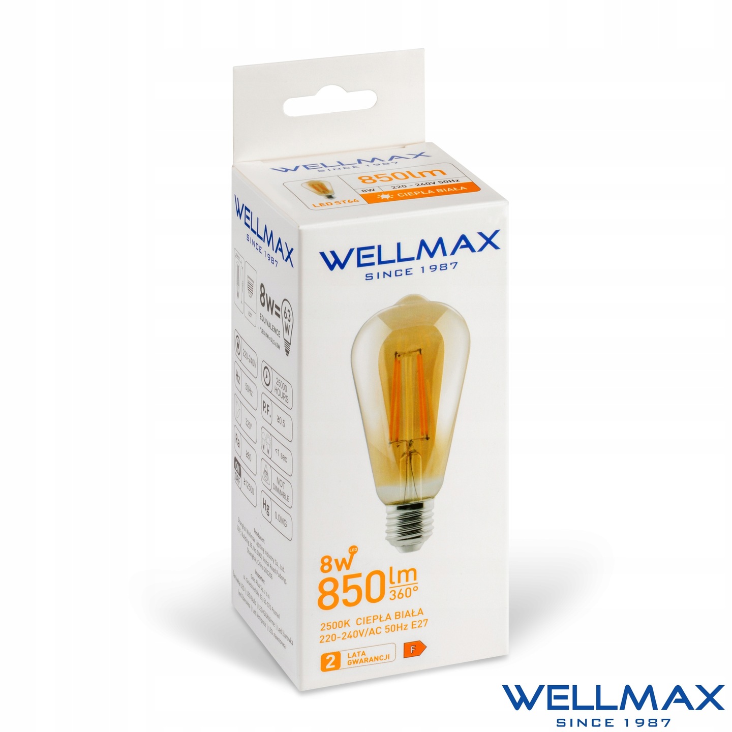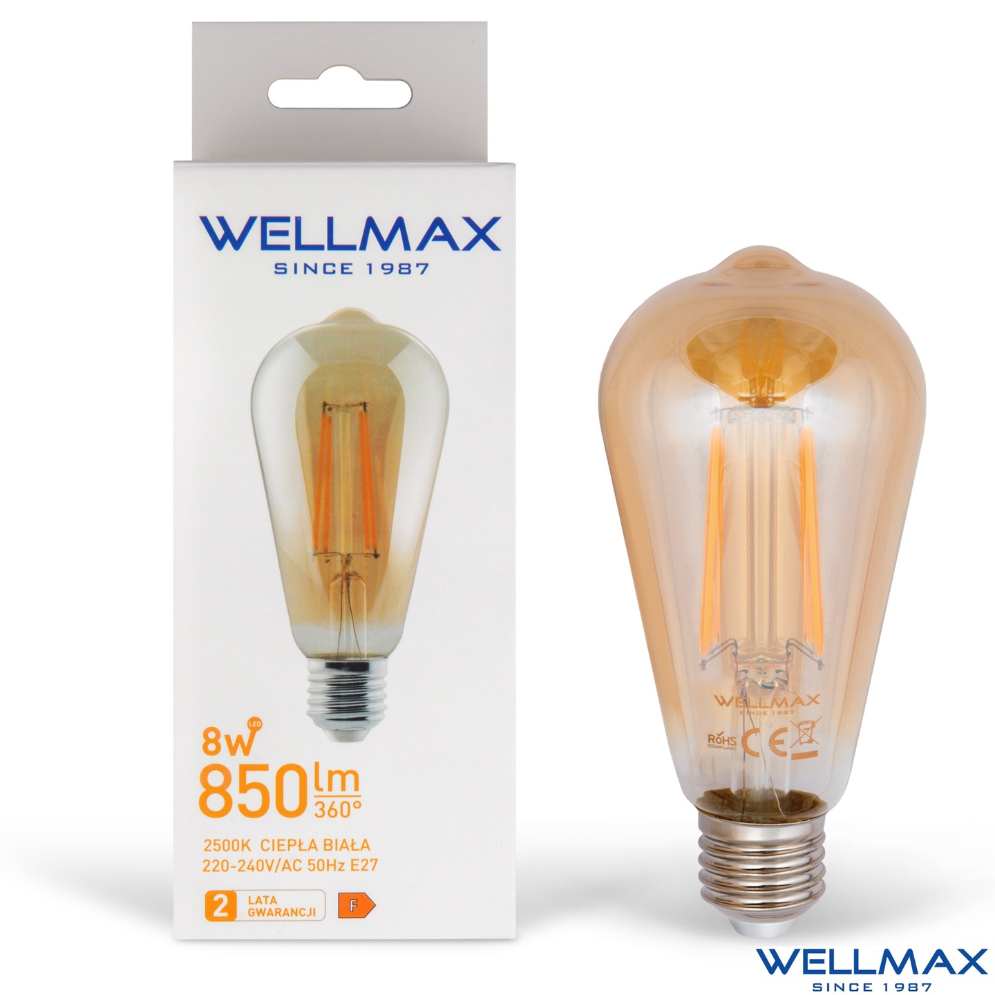 Żarówka WELLMAX LED FILAMENT E27 8W 106lm/W 850lm Barwa Ciepła Biała 2500K