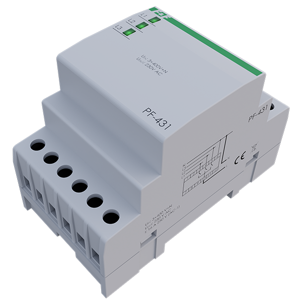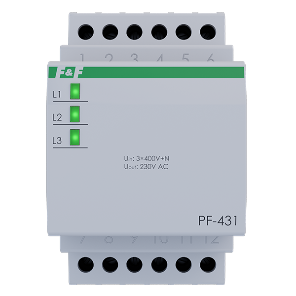 Automatyczny przełącznik faz PF‑431 służy do zasilania jednofazowej instalacji przemysłowej i domowej, zasilanej napięciem 230 V z sieci trójfazowej, 4‑przewodowej. Urządzenie stosowane jest w celu zapewnienia nieprzerwanego zasilania odbiorników jednofazowych i ich ochrony przed niedopuszczalnymi wahaniami napięcia w sieci. W przypadku braku obecności napięcia w poszczególnych fazach, PF‑431 automatycznie dokonuje przełączenia zasilania z tej fazy o najlepszych parametrach i przełącza na tą fazę podłączone do przełącznika odbiorniki jednofazowe. Obok standardowej konstrukcji PF‑431 wyróżniamy również tę, opartą na przekaźniku inrush, tj. PF‑431‑LED, dzięki zastosowaniu w niej takiego styku, przełącznik gwarantuje długotrwałą pracę przy impulsach prądowych dochodzących do 120 A /20 ms.