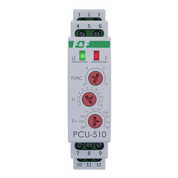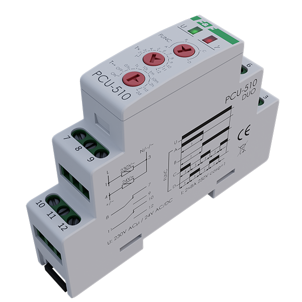PCU‑510DUO to 4‑funkcyjny przekaźnik czasowy, przeznaczony do realizacji funkcji czasowych w układach automatyki i sterowania, zasilany napięciem 24 i 230 V AC. Przekaźnik pozwala na realizację 4 niezależnych trybów pracy wyzwalanych napięciem zasilającym. Cechą wyróżniającą PCU‑510DUO jest jego bardzo szeroki zakres nastaw czasu od 0,1s do 576h. Przekaźnik wyposażony jest w styk 2xNO/NC