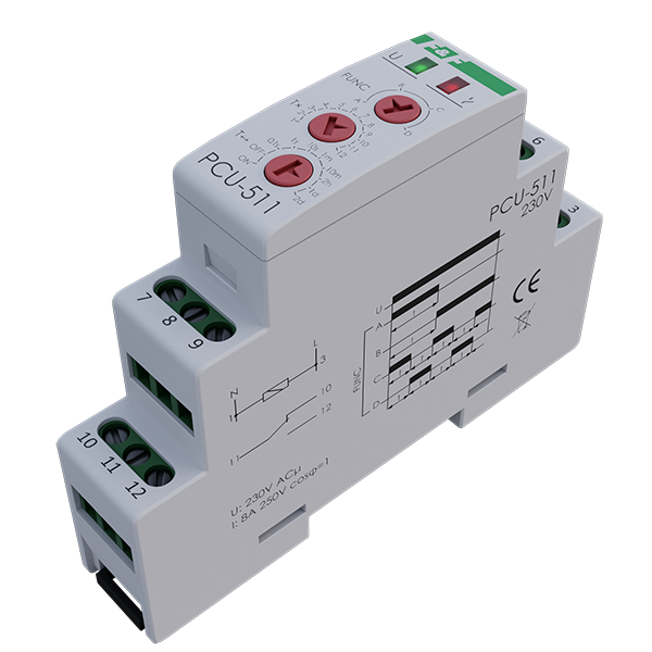 PCU‑511 to 4‑funkcyjny przekaźnik czasowy, przeznaczony do realizacji funkcji czasowych w układach automatyki i sterowania, zasilany napięciem 230 V AC. Przekaźnik pozwala na realizację 4 niezależnych trybów pracy wyzwalanych napięciem zasilającym.