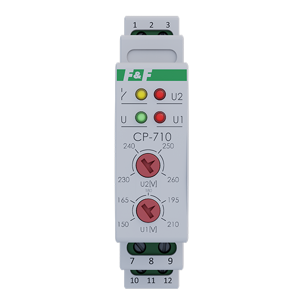 Przekaźnik napięciowy CP‑710 służy do kontroli napięcia sieci jednofazowej i zabezpieczenia odbiornika jednofazowego przed skutkami wzrostu lub spadku napięcia poza ustawione wartości (tzw. Okno napięciowe). Przekaźnik pozwala na blokadę zalączenia odbiornika przy stanach nieustalonych, szybko zmieniającej się wartości napięcia.
