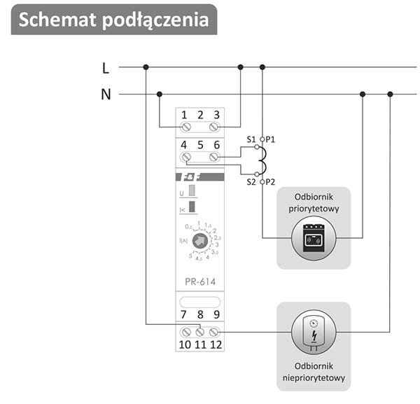 Przekaźnik PR-614 jest przystosowany do współpracy z przekładnikiem prądowym, którego prąd uzwojenia wtórnego nie przekracza 5 A.