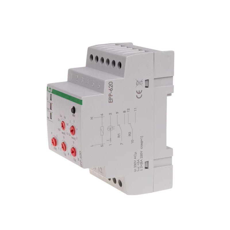 Przekaźnik prądowy EPP-620 służy do kontroli wartości natężenia prądu w mierzonym obwodzie. Z funkcją przełączenia styków w przypadku przekroczeniu wartości natężenia prądu powyżej i poniżej ustawionych wartości progowych.