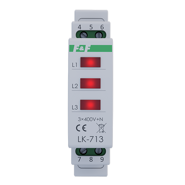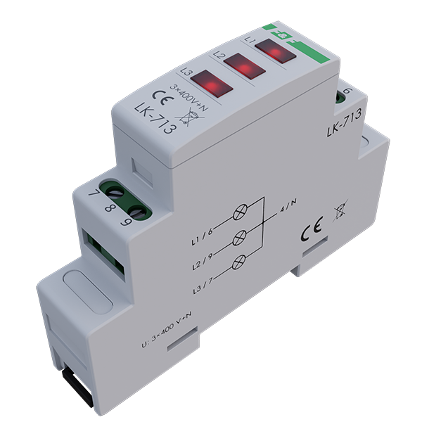 Lampki sygnalizacyjne zwane również wskaźnikami zasilania LK‑713R (LED czerwone) służą do sygnalizacji napięcia w sieci trójfazowej. Sygnalizacja zasilania odbywa się za pomocy trzech diod LED.