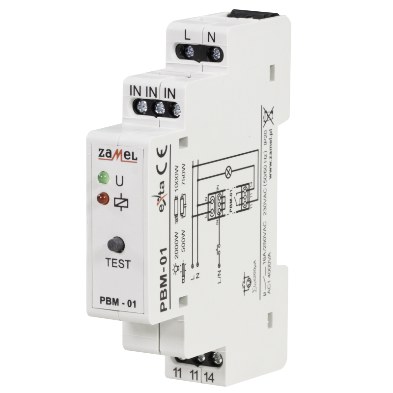 Przekaźnik bistabilny PBM‑01 służy do sterowania oświetleniem lub dowolnym innym urządzeniem za pomocą równolegle podłączonych przycisków jednobiegunowych.