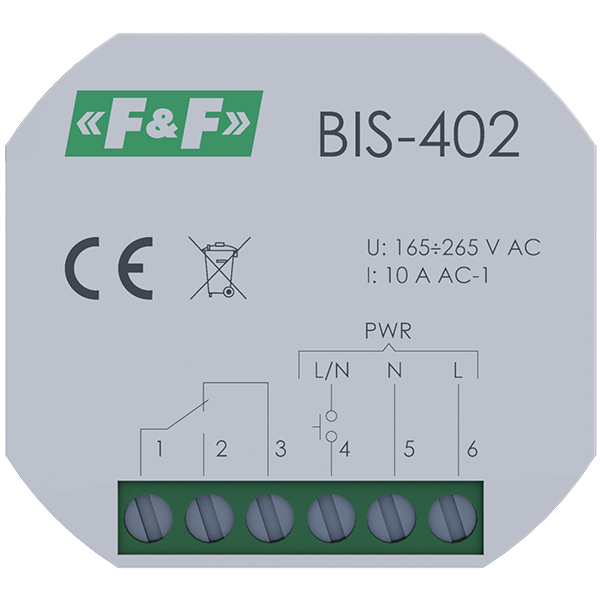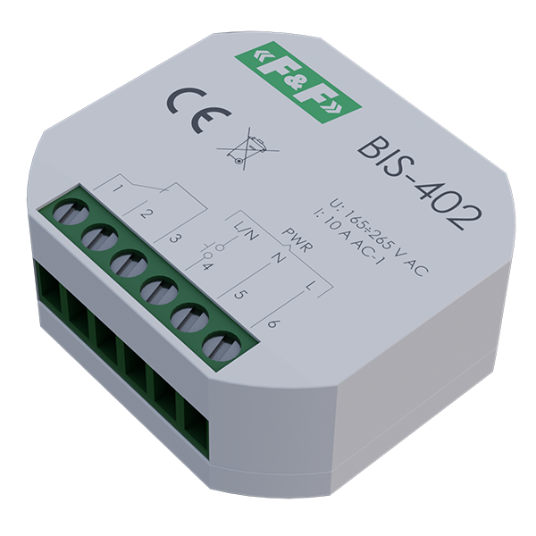 Przekaźnik BIS‑402 nie posiada "pamięci" pozycji styku, tzn., że w przypadku zaniku napięcia zasilania i jego ponownym powrocie styk przekaźnika zostanie ustawiony w stan wyłączenia. Uniemożliwia to samoczynne załączenie sterowanych odbiorników bez nadzoru po długotrwałym zaniku napięcia zasilania.