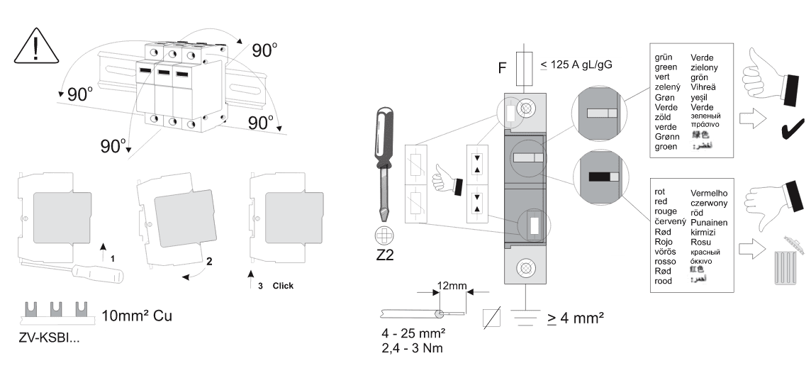 Ograniczniki przepięć mają oznakowane zaciski — od góry aparatu podłączamy przewody zasilające, a od dołu przewód ochronny. Ponadto dokręcać przewody należy kluczem dynamometrycznym z odpowiednim momentem, aby podczas odprowadzania prądu udarowego przewody nie wypadły z zacisków.