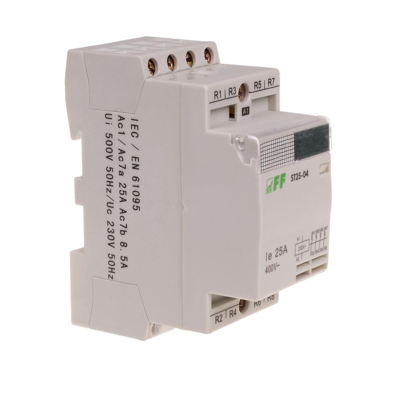 Stycznik modułowy. Prąd 25 A. Napięcie 230 V AC. Moc łączeniowa AC1 9 kW. Moc łączeniowa AC3 2,2 kW.