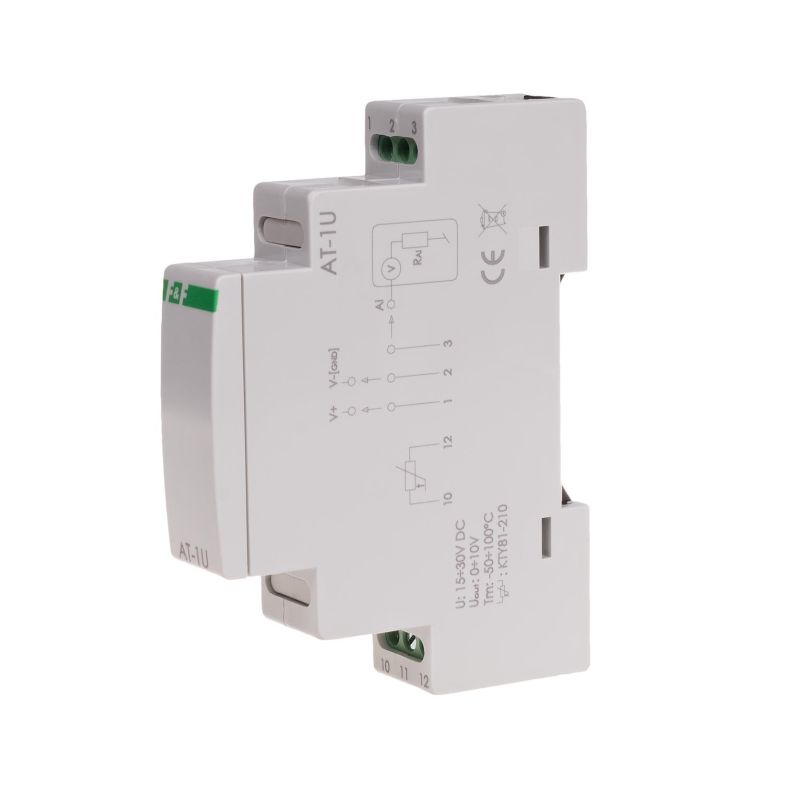 Przetwornik temperatury AT-1U przeznaczony jest do pomiaru temperatury za pomocą zewnętrznego czujnika temperatury i przekształcania mierzonej wielkości do unifikowanego analogowego wyjściowego sygnału napięciowego w zakresie 0÷10 V.