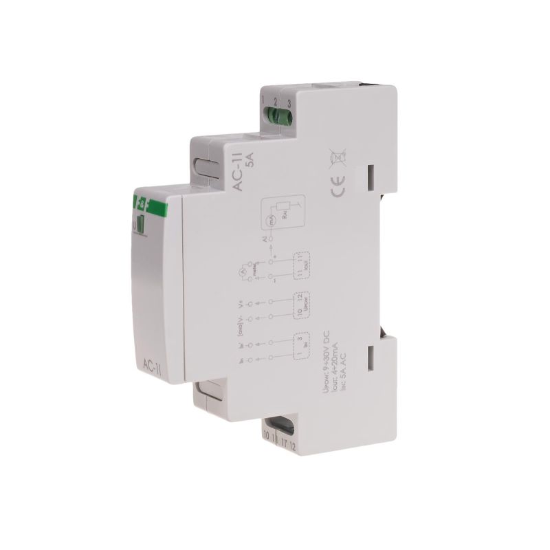 Przetwornik natężenia prądu AC-1I 5 A służy do pomiaru natężenia prądu zmiennego lub stałego. Przekształca mierzoną wielkość do unifikowanego analogowego wyjściowego sygnału prądowego w zakresie 4÷20 mA.