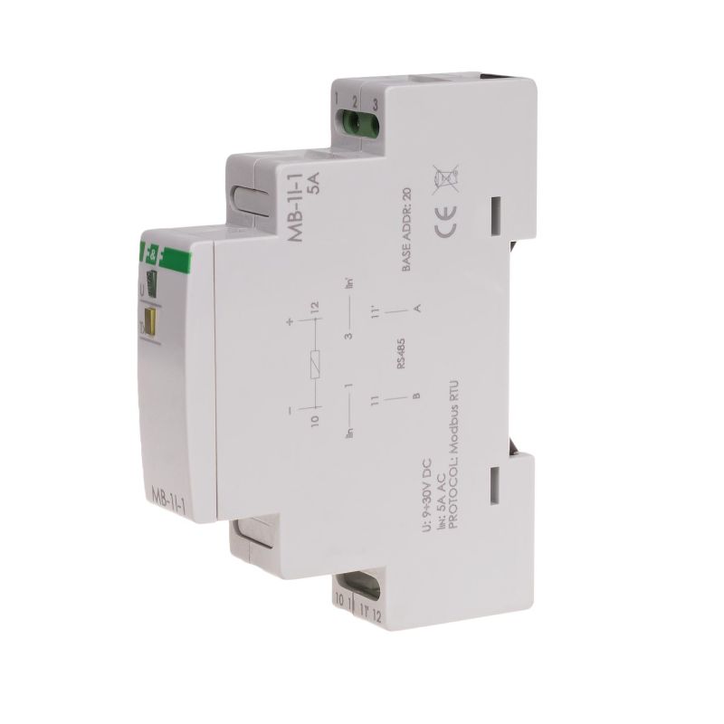Przetwornik MB-1I-1 przeznaczony jest do pomiaru natężenia prądu zmiennego lub stałego i wymiany danych za pomocą portu RS-485 zgodnie z protokołem MODBUS RTU.