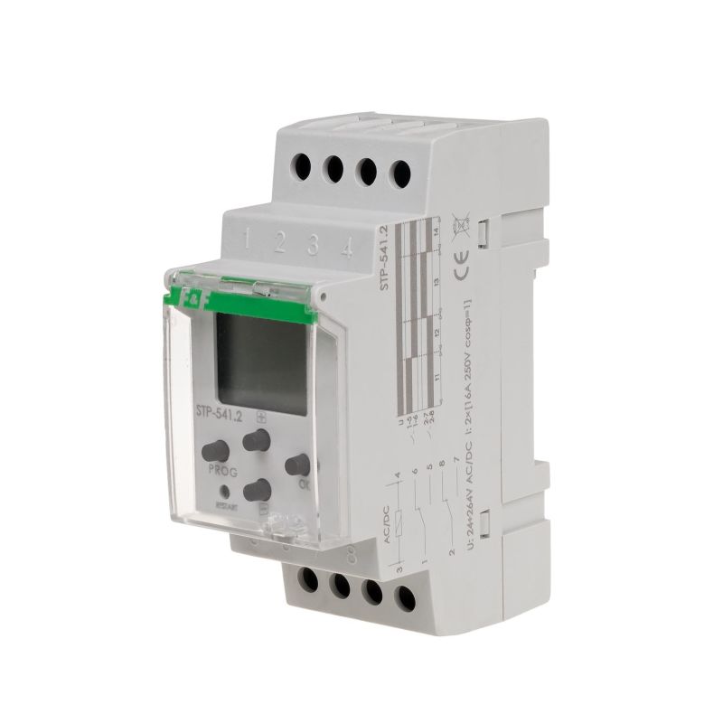 Sterownik czasowy realizuje pracę zgodnie z programem czterech czasów i liczbą cykli. Cykl to sekwencja czterech następujących po sobie załączeń styków. Po załączeniu zasilania sterownik automatycznie przechodzi do realizacji programu. Styk zostanie przełączony w poz. 1-5 na czas t1. Po czasie t1 styk powróci do położenia 1-6 na czas t2. Dopiero po czasie t2 drugi styk zostanie przełączony w poz. 2-7 na czas t3. Po czasie t3 styk przełączony w poz. 2-8 na czas t4. Po czasie t4 sterownik rozpocznie cykl programu od początku (od czasu t1). Cykl zostanie powtórzony zgodnie z zaprogramowaną liczbą powtórzeń lub nieskończenie, przy pracy w “pętli”. Zanik napięcia zasilania >1sek spowoduje zatrzymanie realizacji programu sterownika. Po ponownym załączeniu zasilania sterownik czasowy STP-541 zacznie realizować program od początku łącznie z zaprogramowaną liczbą powtórzeń cykli.