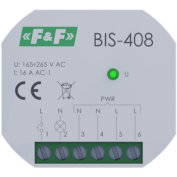 Przekaźnik bistabilny BIS‑408 występuje w wersji BIS‑408i przystosowanej do załączania odbiorników o dużym prądzie udarowym, takich jak: lampy LED, świetlówki ESL, transformatory elektroniczne, lampy wyładowcze itp.