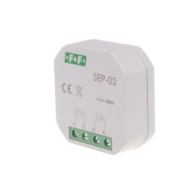 SEP-02 służy do separacji sygnałów sterujących w układach automatyki z wydzielonymi podgrupami sterowania i sterowaniem centralnym.
