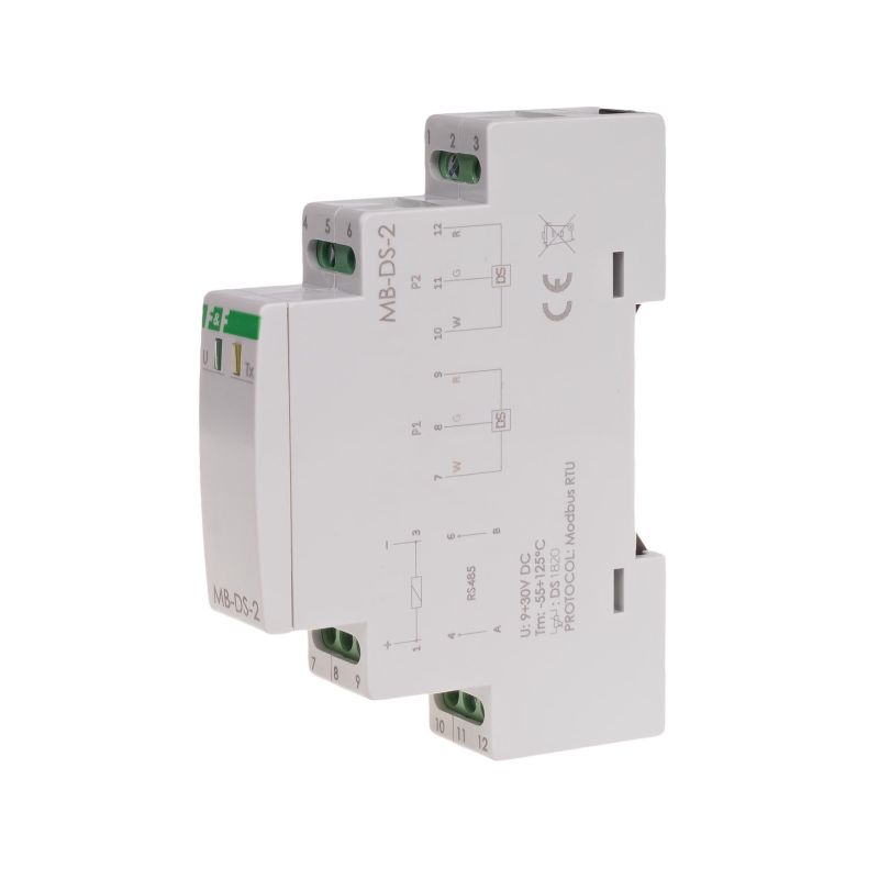 Przetwornik pomiarowy temperatury MB-DS-2 przeznaczony jest do pomiaru temperatury za pomocą zewnętrznego czujnika temperatury DS1820 lub DS18B20 i wymiany danych za pomocą portu RS-485 zgodnie z protokołem MODBUS RTU.