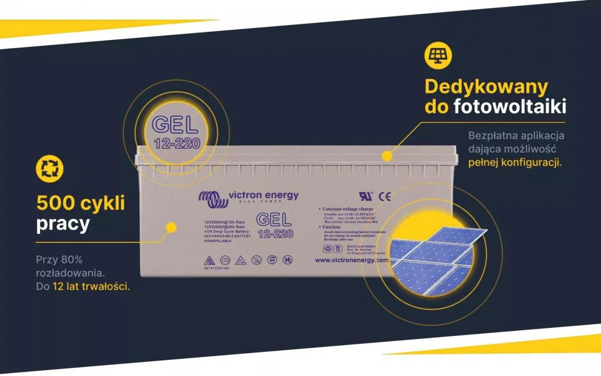 W akumulatorach Victron Energy zastosowana jest w 100% technologia żelowa. Oznacza to, że elektrolit w akumulatorze jest zżelowany. Dzięki temu akumulator dużo lepiej znosi pracę cykliczną, głębokie rozładowania oraz niskie temperatury.