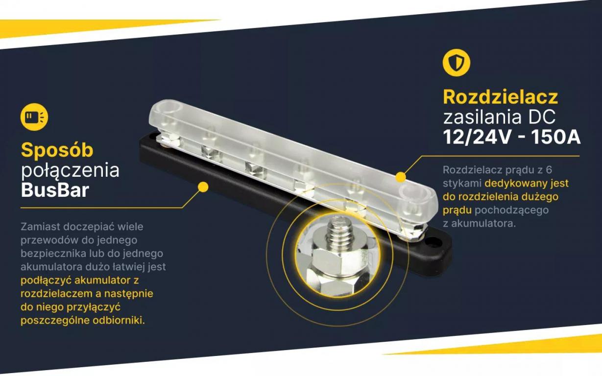 Rozdzielacz zasilania DC 12/24V - 150A z 6 stykami dedykowany jest do rozdzielenia dużego prądu pochodzącego z . Zamiast doczepiać wiele przewodów do jednego bezpiecznika lub do jednego akumulatora dużo łatwiej jest podłączyć akumulator z rozdzielaczem a następnie do niego przyłączyć poszczególne odbiorniki. Taki sposób połączenia zapewnia estetykę oraz wygodę a co najważniejsze bezpieczeństwo połączeń.