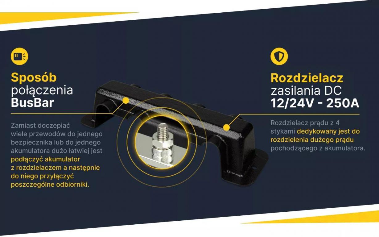 Rozdzielacz zasilania DC 12/24V - 250A z 4 stykami dedykowany jest do rozdzielenia dużego prądu pochodzącego z . Zamiast doczepiać wiele przewodów do jednego bezpiecznika lub do jednego akumulatora dużo łatwiej jest podłączyć akumulator z rozdzielaczem a następnie do niego przyłączyć poszczególne odbiorniki. Taki sposób połączenia zapewnia estetykę oraz wygodę a co najważniejsze bezpieczeństwo połączeń.