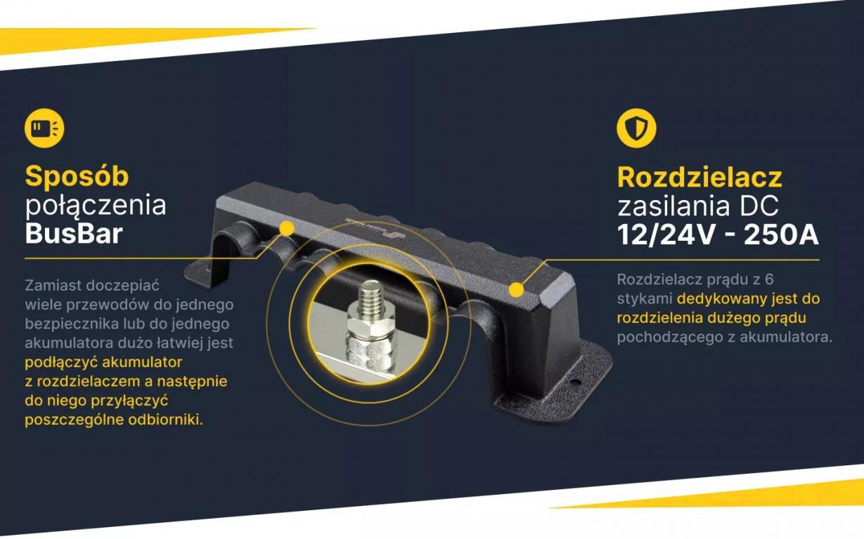 Rozdzielacz zasilania DC 12/24V - 250A z 6 stykami dedykowany jest do rozdzielenia dużego prądu pochodzącego z . Zamiast doczepiać wiele przewodów do jednego bezpiecznika lub do jednego akumulatora dużo łatwiej jest podłączyć akumulator z rozdzielaczem a następnie do niego przyłączyć poszczególne odbiorniki. Taki sposób połączenia zapewnia estetykę oraz wygodę a co najważniejsze bezpieczeństwo połączeń.